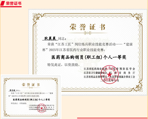 近日,在江苏省医药商业协会、江苏省预防医学会、江苏省卫生健康委员会、江苏省商务厅和江苏省药品监督管理局联合举办的“‘江苏工匠’岗位练兵职业技能竞赛活动--‘建康杯’”2025年江苏省医药行业职业技能竞赛中,公司耿晨晨、李宗琪两名职工代表参赛,在竞争激烈的“医药商品购销员(职工组)”赛项中脱颖而出,分别斩获一等奖和二等奖,为公司荣誉榜再添浓墨重彩的一笔!